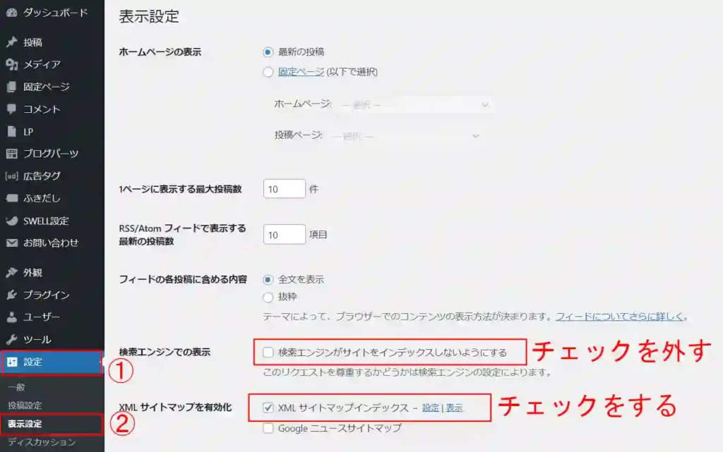 1つ目は表示設定の部分の設定で、Word Pressのトップの左のメニューから「設定」→「表示設定」で表示されます。表示設定部分で、検索エンジンでの表示のチェックを外す、XMLサイトマップインデックスにチェックの2つの設定を確認する必要がありました。