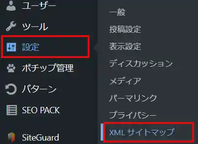 XML Sitemapの設定を開くにはWord Pressのトップ画面の左のメニューから「設定」→「XMLサイトマップ」で開くことができます。