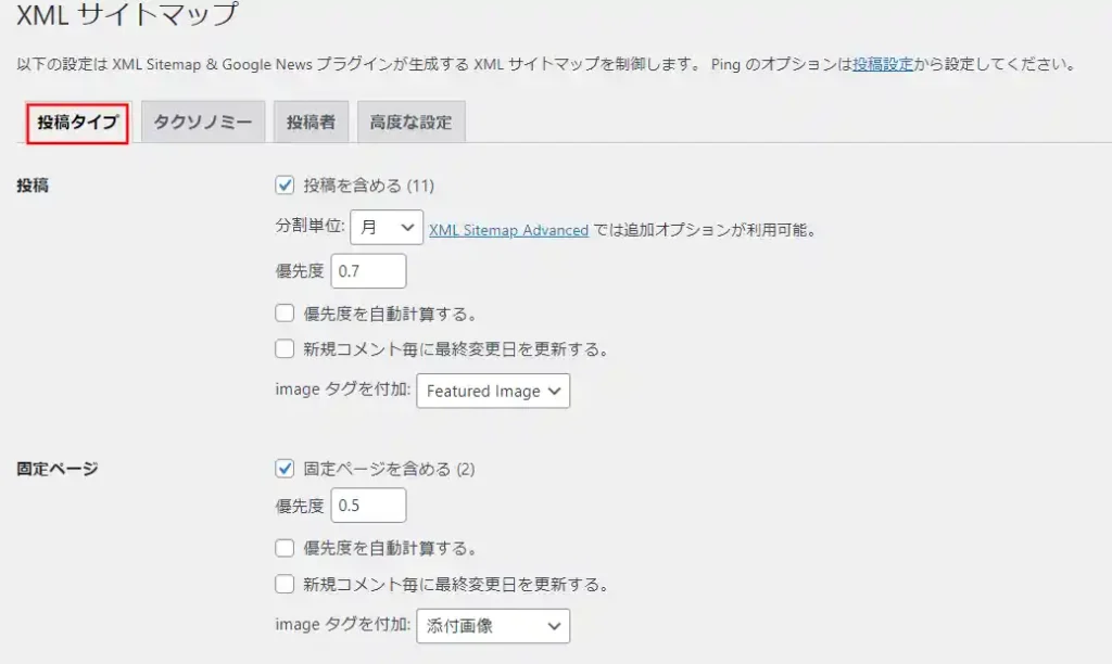 2つ目はXML Sitemapの設定で、投稿タイプ、タクソノミー、投稿者、高度な設定の4つのタブがありますが、投稿者、高度な設定の2つはデフォルトのままでOKでした。