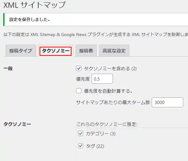 XMLサイトマップの設定画面から「タクソノミー」を選択します。